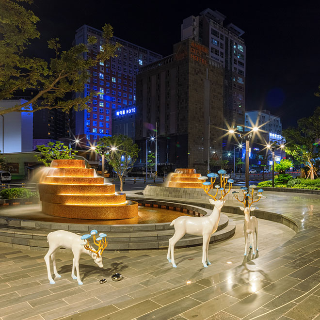 Enjoy the colorful LED light show emanating from the largest public podium in Korea. Inspired by the island's volcanic craters and golden lava, these shifting lights and colors at the Grand Plaza is designed to represent the beauty of Jeju island. Witness the daily light and water jet show every hour on the hour as you enjoy the cool Jeju breeze.