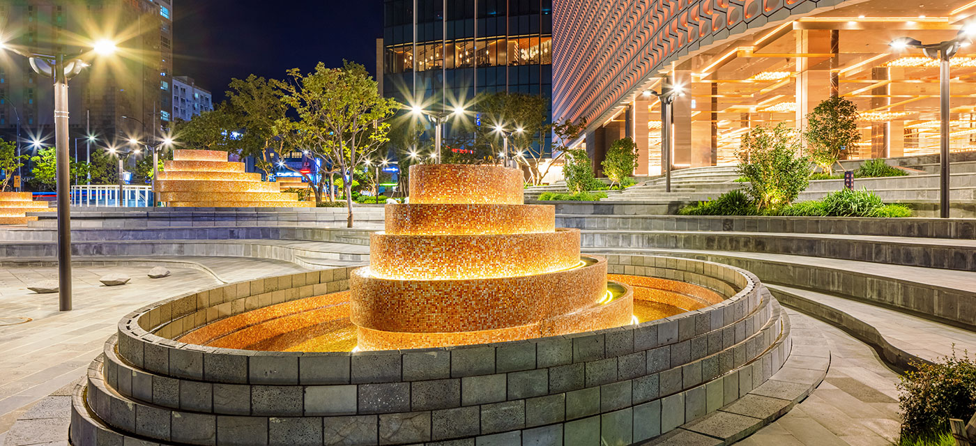 A collaboration between renowned landscape designer Martha Swartz and water feature specialists WET Designs, the Grand Plaza is a 3,000m² social and cultural space for local Jeju residents and the general public to enjoy. Spectacular six-foot fountains with changing lights are inspired by Jeju's volcanic craters. Enjoy the daily podium light show and water jet displays along with the interactive media façade in the background.